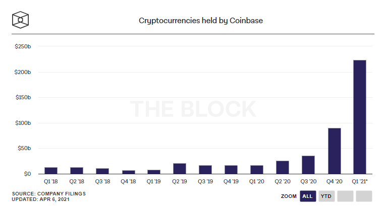 • На Coinbase хранятся активы на $223 млрд.