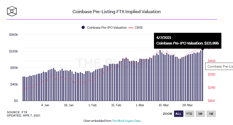 На криптобирже FTX сейчас торгуются токенизированные акции Coinbase и там оценка компании составляет $121.7 млрд.