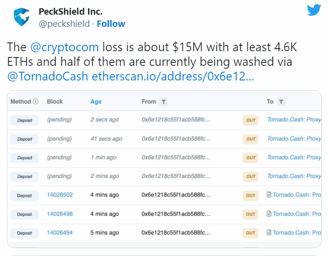 Однако так не считает аналитическая компания CertiK, которая сообщила о взломе Crypto․com. По ее данным, в результате атаки биржа лишилась 4 600 ETH, которые были отправлены в миксер Tornado Cash.
