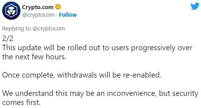 Спустя несколько часов биржа заявила об успешном решении проблемы и возобновлении вывода средств. При этом нет никакой информации об убытках, которые она понесла. Генеральный директор Crypto․com Крис Маршалек сообщил, что активы клиентов не были потеряны.