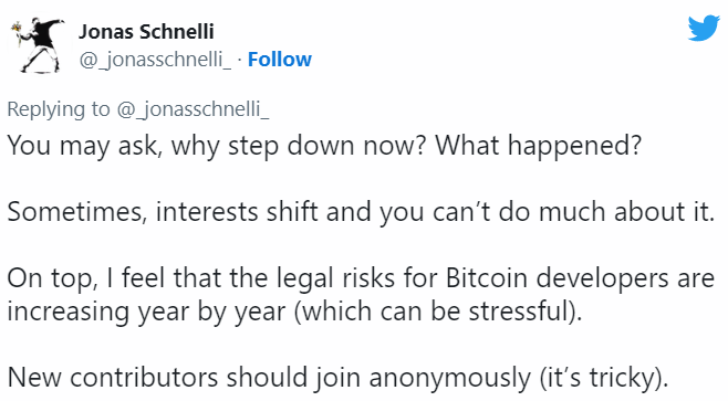 Вы спрашиваете зачем уходить сейчас? Что случилось? Иногда интересы меняются, и вы ничего не можете с этим поделать. Кроме того, я чувствую, что юридические риски для биткоин-разработчиков стремительно растут с каждым годом (и это напрягает). Новые специалисты должны задуматься над своей анонимностью (а это сложно)». Источник