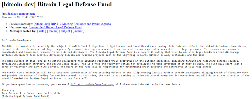 Объявление об учреждении фонда было отправлено с электронной почты, принадлежащей самому Дорси. Разработчики (bitcoin-dev) получили рассылку 12 января в 03:00 МСК.