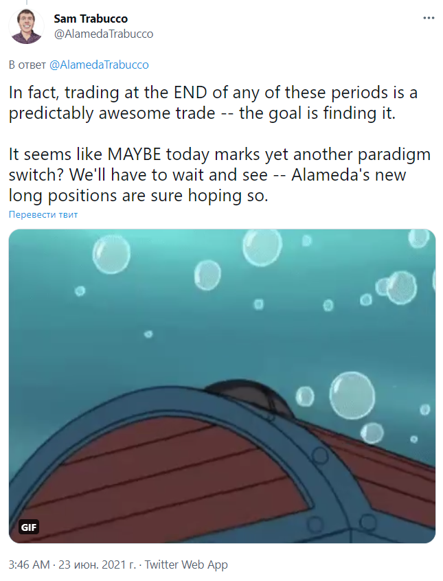 «Может, сегодня мы наблюдаем смену парадигмы? Новые длинные позиции Alameda на это надеются», — написал Трабукко. Он имел в виду, что его компания встала в лонг, поскольку ожидает разворота рынка от текущих значений.