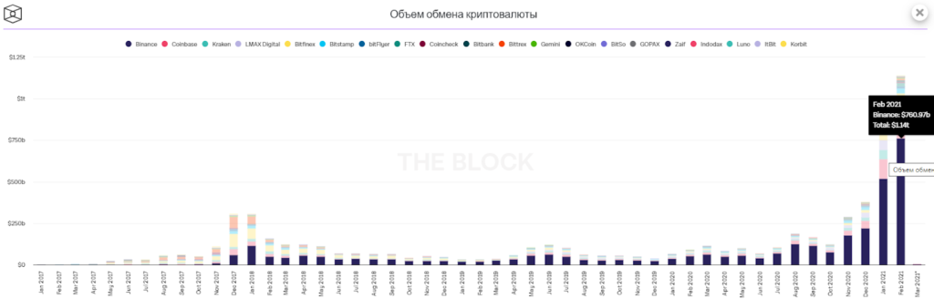 Из них $760 млрд, или почти 67%, пришлись на биржу Binance. Затем идет Coinbase ($118 млрд), а на третьем месте — Kraken с показателем $60 млрд.