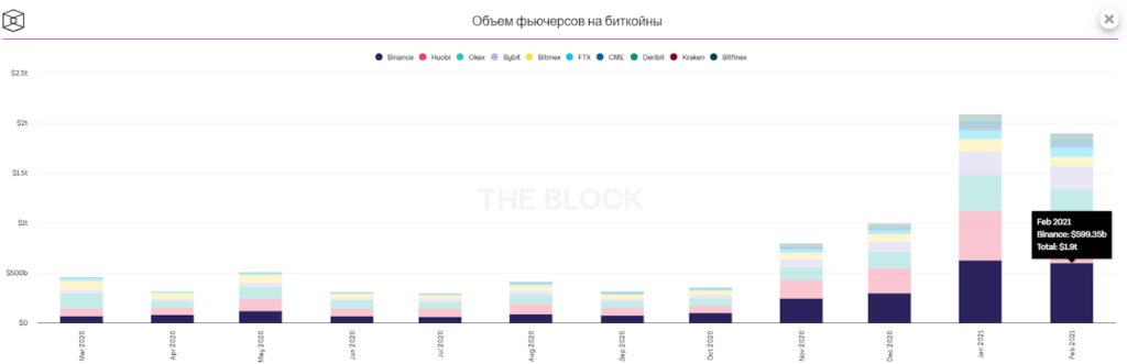 Объем торгов фьючерсами на биткоин в феврале составил $1.9 трлн по всем биржам. В январе показатель был $2.09 трлн. Лидер опять же Binance — $600 млрд. На втором месте Huobi ($450 млрд), на третьем — OKEx с показателем $288 млрд.
