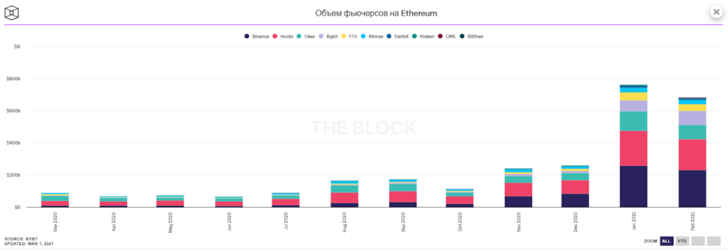 На рынке фьючерсов на ETH ситуация аналогичная — показатель немного не дотянул до рекорда января и составил $684 млрд (в январе — $762 млрд).