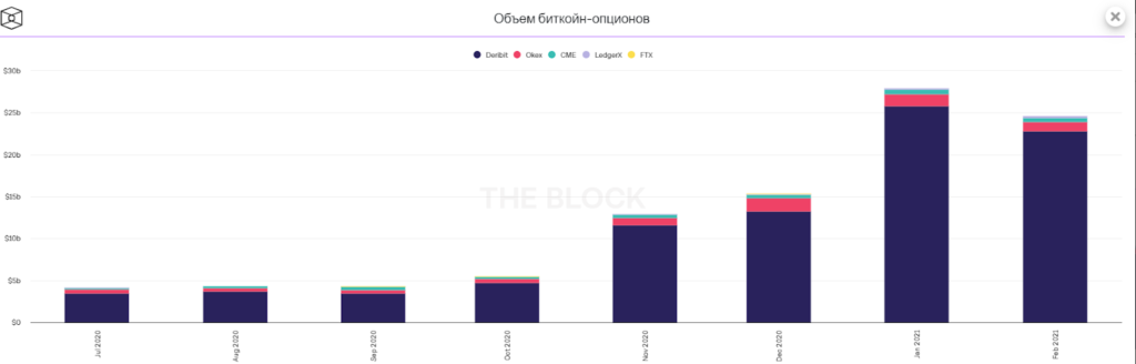 Объем торгов опционами на биткоин в феврале составил $24 млрд. Тут биржа Deribit — несомненный лидер, поскольку занимает больше 90% рынка.