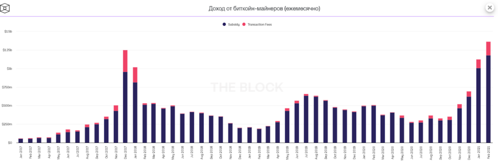 Майнеры биткоина в феврале заработали рекордные $1.36 млрд. На комиссии приходятся $186 млн.