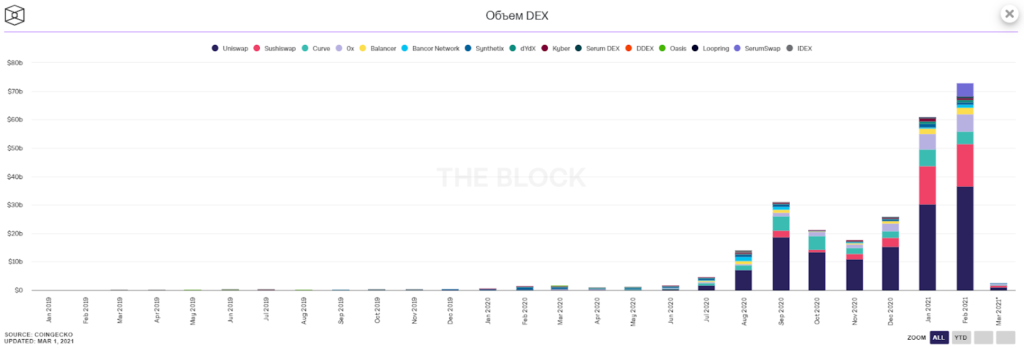 Объем торгов на децентрализованных биржах в феврале достиг практически $73 млрд. Лидер — Uniswap с показателем $36.6 млрд.