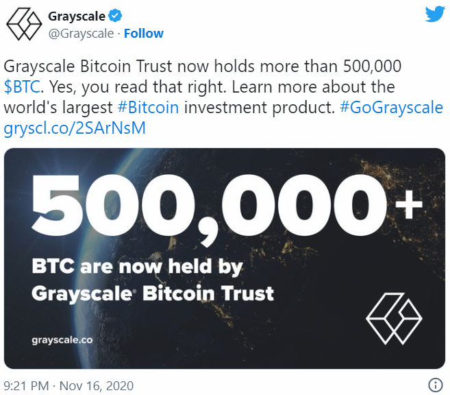 Компания Grayscale Investments в Twitter сообщила, что в распоряжении ее биткоин-траста уже более 500 000 BTC. В долларовом эквиваленте это примерно $8.35 млрд.