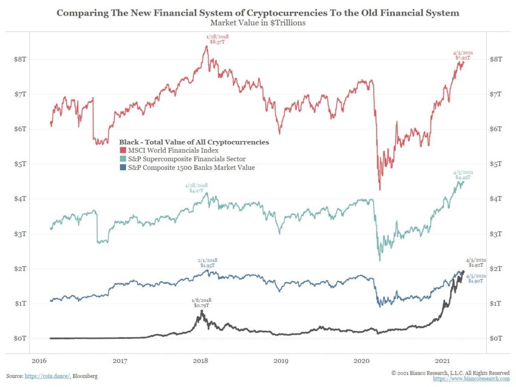 В начале второго квартала 2021 года криптовалютный рынок преодолел значимый рубеж в $2 трлн, согласно данным CoinGecko. Глава аналитической компании Bianco Research Джим Бьянко обращает внимание, что теперь криптовалютный рынок имеет большую ценность, чем вся банковская система США.