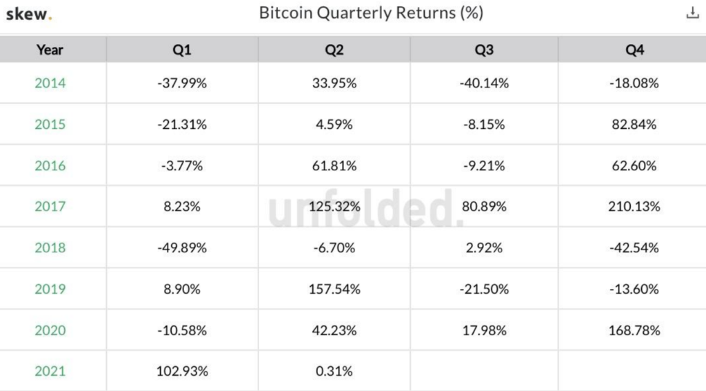 Традиционно первый квартал является плохим для криптовалютного рынка, однако не в этот раз. Биткоин вырос на 103% за первые три месяца 2021 года, некоторые другие криптоактивы показали еще более сильный рост.