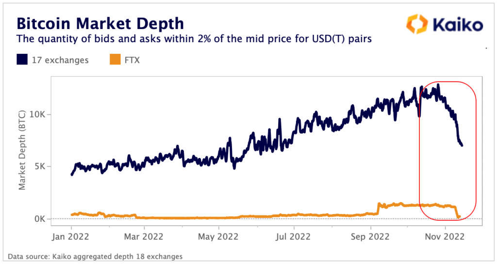 Kaiko отмечает, что глубина на рынке биткоина, которая означает способность рынка поглощать крупные ордера в течение определенного периода времени, значительно снизилась: в стакане Kraken глубина была снижена на 57%, на Binance и Coinbase она упала на 25% и 18% соответственно.