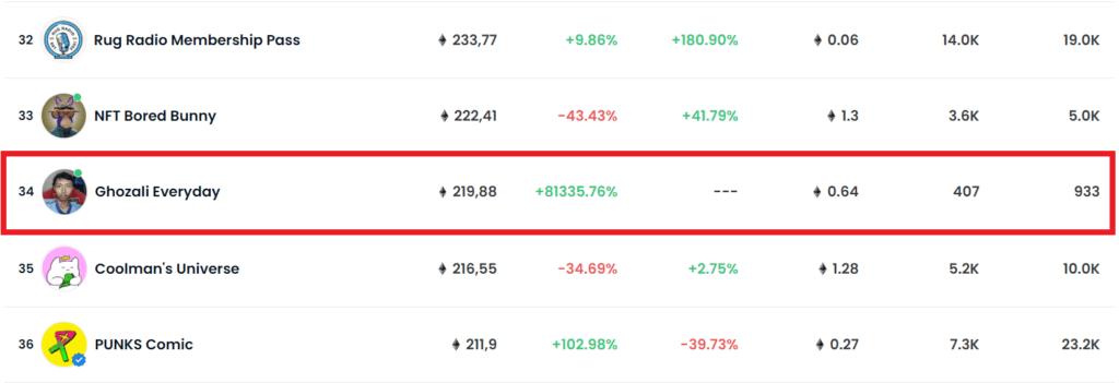 Коллекция Ghozali Everyday расположена на 34 месте в рейтинге по объему торгов. Источник