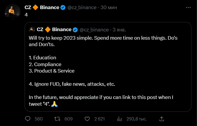 Глава Binance Чанпэн Чжао опубликовал в Twitter цифру 4 в ответ на свое сообщение от 3 января, где под четвертым пунктом идет призыв игнорировать FUD, фейковые новости, атаки и прочее.