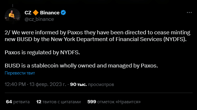 «Мы получили информацию от Paxos о том, что Департамент финансовых услуг Нью-Йорка (NYDFS) приказал им прекратить выпуск новых BUSD. Paxos регулируется NYDFS. BUSD — это стабильная монета, полностью принадлежащая и управляемая Paxos». Источник
