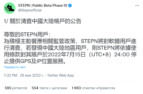 «Объявление о проверке аккаунтов из Китая. Уважаемые пользователи! Чтобы активно реагировать на нормативную политику, STEPN проведет инвентаризацию учетных записей. В случае обнаружения пользователей из материкового Китая STEPN прекратит предоставление GPS для соответствующих учетных записей 15 июля». Источник.