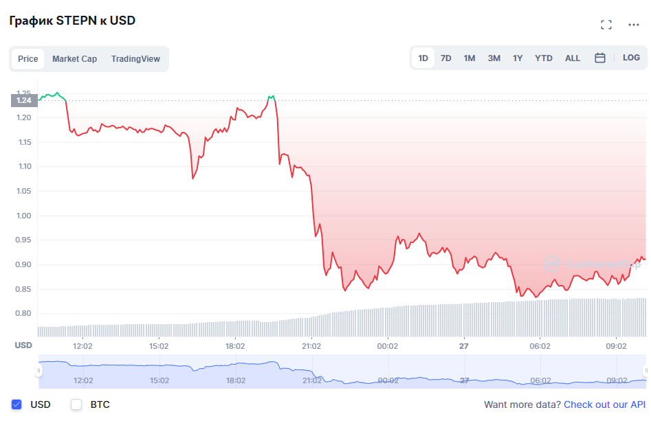 Цена нативного токена платформы STEPN GMT упала на 26% за последние сутки.