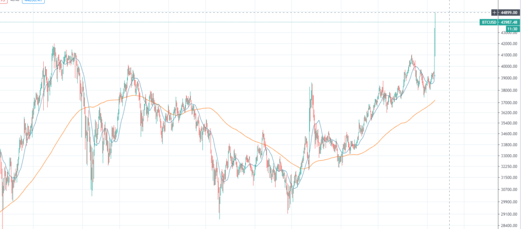 Сразу после выхода данной новости первая криптовалюта устремилась вверх, за считанные минуты преодолев исторический максимум и установив новый на уровне $44 900.