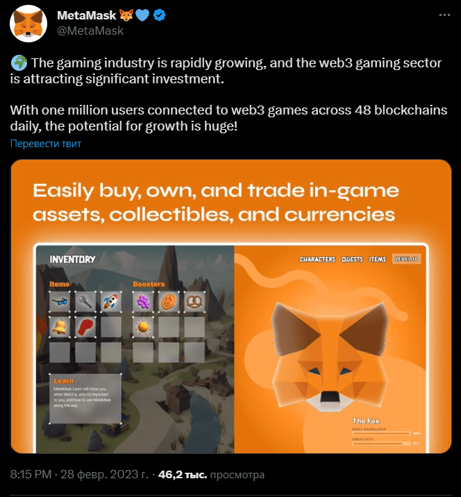 «Игровая индустрия быстро растет, и сектор Web3-игр привлекает значительные инвестиции. С миллионом пользователей, ежедневно подключающихся к веб-играм через 48 блокчейнов, потенциал для роста огромен», — прокомментировали разработчики MetaMask.