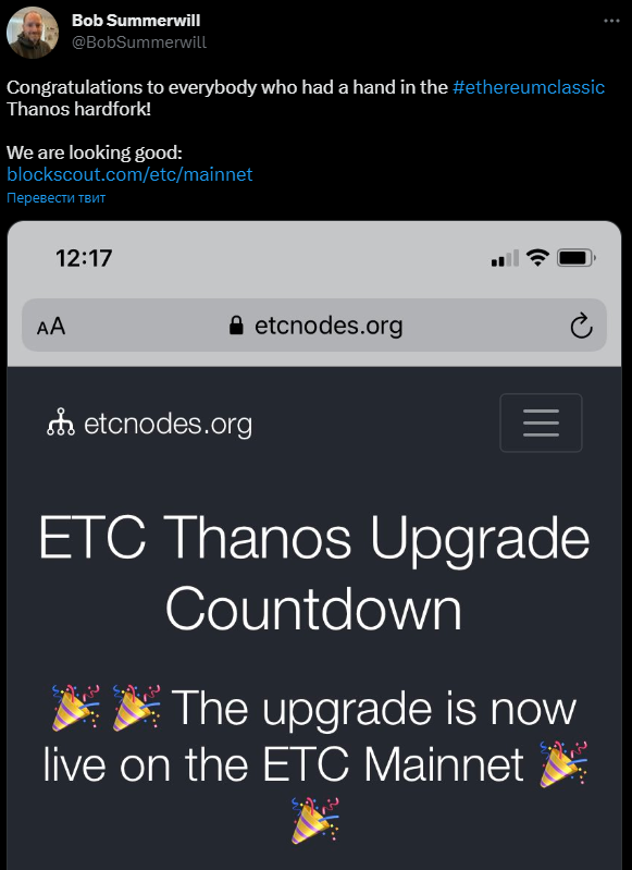 «Поздравляю всех, кто принимал участие в обновлении Ethereum Classic. Thanos успешно запущен», — написал исполнительный директор ETC Cooperative Боб Саммервилл.
