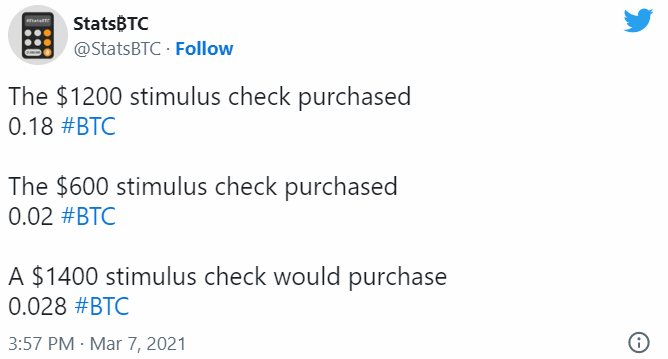 Почему он так считает? Во-первых, биткоин многими позиционируется как инструмент для защиты от инфляции, ведь у него эмиссия строго фиксирована и заложена в алгоритме. Во-вторых, некоторые американцы предыдущие полученные чеки на $1 200 направили в биткоин. К слову, сегодня эта инвестиция оценивается практически в $10 000.
