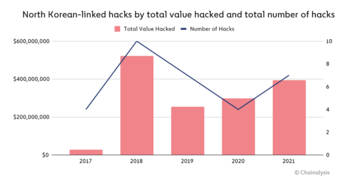 Согласно отчету исследовательской компании Chainalysis за 2021 год, северокорейские киберпреступники совершили семь крупных атак на криптовалютные платформы. В результате были похищены активы на общую сумму $400 млн.