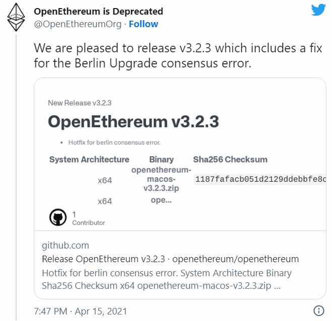 Сообщение OpenEthereum в Twitter.