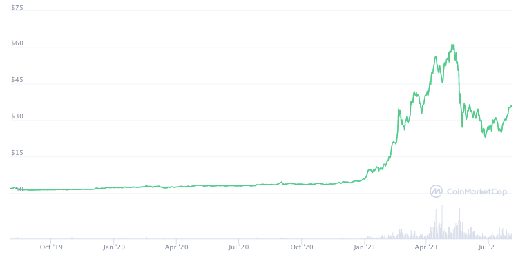 На старте торгов в августе 2019 года FTT стоил $1.8. В мае цена токена достигла своего исторического максимума в $62.7, после чего вместе со всем рынком упала в несколько раз. В конце июня FTT достиг локального минимума в $22.3, а сейчас поднялся до $35. Капитализация проекта составляет $3.31 млрд.
