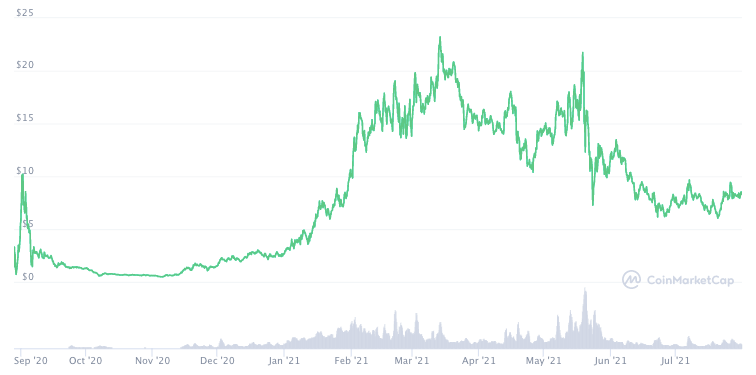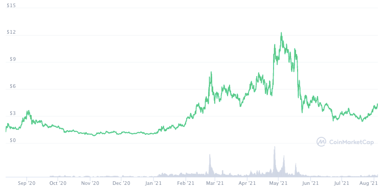 Токенсейл нативного токена платформы SRM прошел в августе 2020 года, собрав $660 000. Всего за несколько секунд после листинга на Binance цена токена выросла более чем в 10 раз. С тех пор SRM вырос еще в 4 раза. Сейчас SRM стоит $4.27, его капитализация — $213 млн.