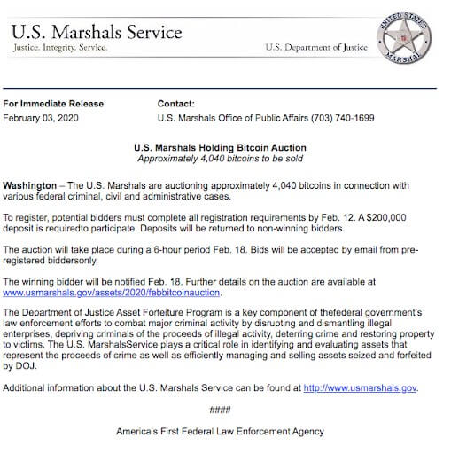 Объявление об аукционе по продаже 4 040 BTC Службой маршалов в феврале 2020 года. Источник.