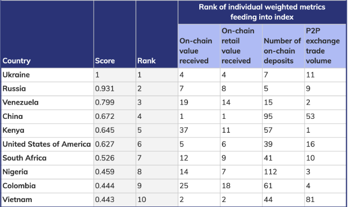 По данным сентябрьского отчета аналитической фирмы Chainalysis, Украина занимает лидирующую позицию в индексе глобального принятия криптовалют. Следом за ней идут Россия, Венесуэла, Китай, Кения и США.
