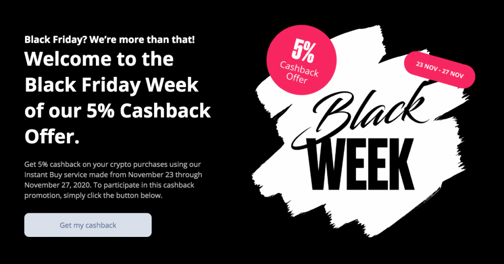 Биржа CEX.io предлагает в течение последней недели ноября кешбэк в размере 5% клиентам, которые совершат покупки с использованием платежной карты Visa или Mastercard через сервис мгновенной покупки CEX.io или приложение биржи. Кешбэк начисляется на счет пользователя площадки в течение 3 дней. Максимальная сумма кешбэка — $200.