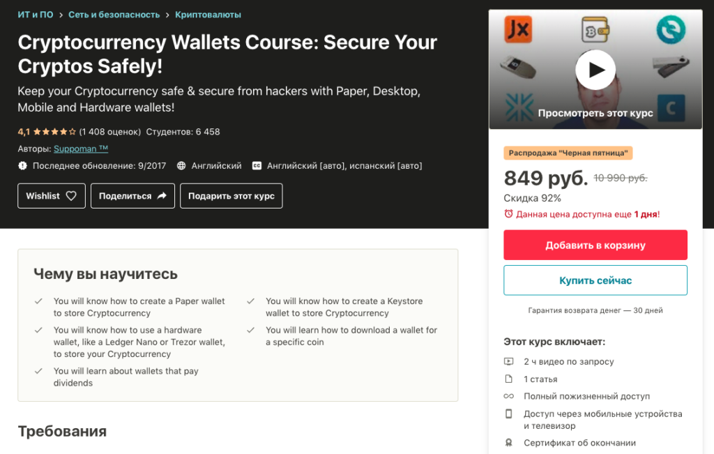 • Криптовалютные кошельки: как защитить и обезопасить свои криптовалюты. Курс научит открывать горячие и использовать холодные блокчейн-кошельки, расскажет о преимуществах и недостатках каждого типа кошелька.