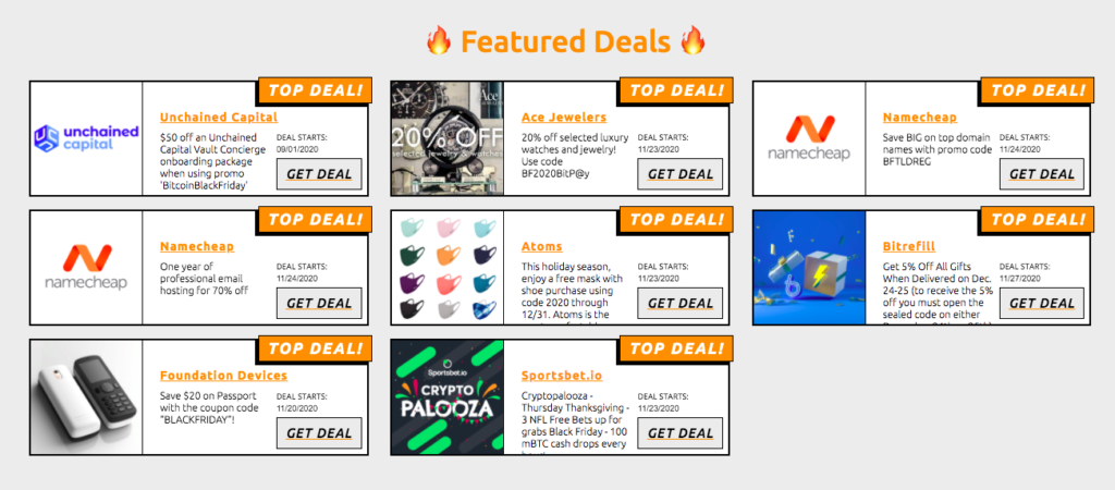 Еще один агрегатор ритейлеров, принимающих криптовалюты и проводящих распродажи, — это сайт CryptoBlackFriday. На нем можно найти продавцов, принимающих не только биткоин, но и одну из других 8 популярных монет.