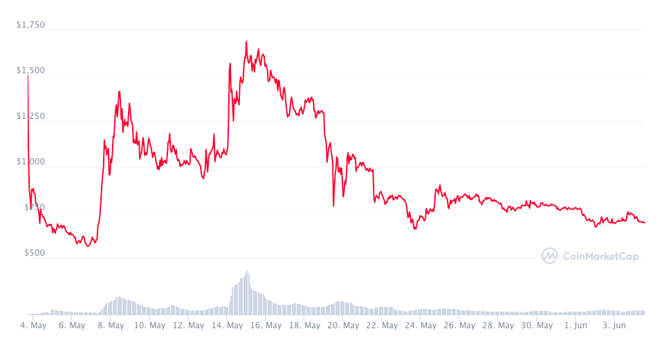 Запуск торгов ХСН состоялся 3 мая с $1 500. Однако всего за сутки цена упала вдвое, и 6 мая достигла своего нынешнего минимума в $566. Далее цена актива снова пошла вверх, 15 мая достигнув своего максимума в $1 685. Но с тех пор ХСН находится в нисходящем тренде и сейчас стоит около $540.