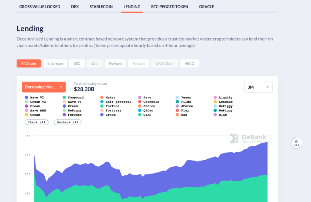 - Кредитные протоколы. DeBank показывает статистические данные по кредитным протоколам в нескольких аспектах. Например, размер капитала, общий объем депозитов, общий объем заимствований и процентная ставка, общий объем и детали ежедневной ликвидации долгов на каждой платформе.