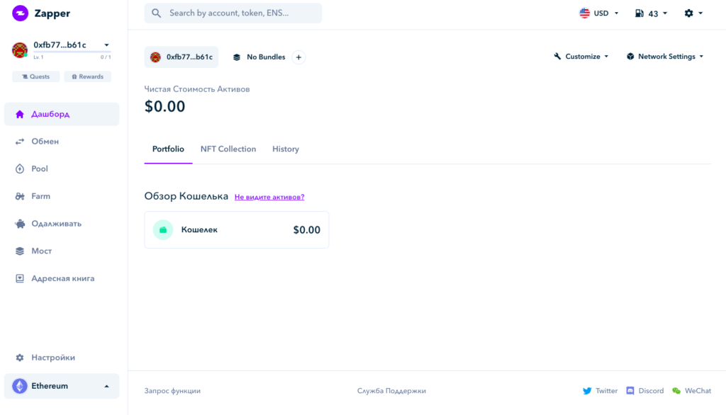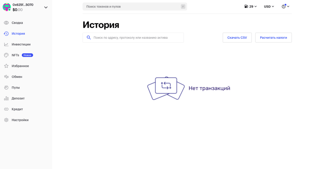 У Zerion простой и понятный, частично русифицированный интерфейс. В личном кабинете пользователю доступны вкладки со всеми возможностями Zerion, такими как история транзакций, обмен и депозиты среди прочего. Рассмотрим их подробнее.