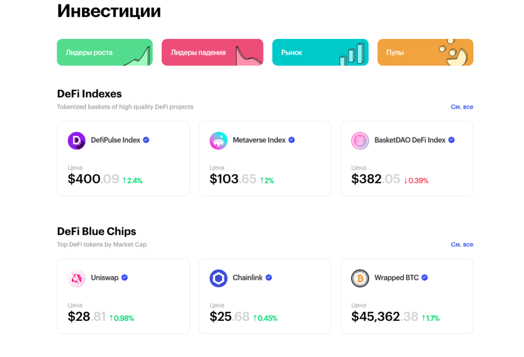 Инвестиции. Здесь пользователь может купить различные DeFi-активы, в том числе DeFi-индексы, NFT и токены децентрализованных бирж. Напомним, что Zerion поддерживает более 60 DeFi-протоколов. При изменении цены активов платформа пришлет push-уведомление.