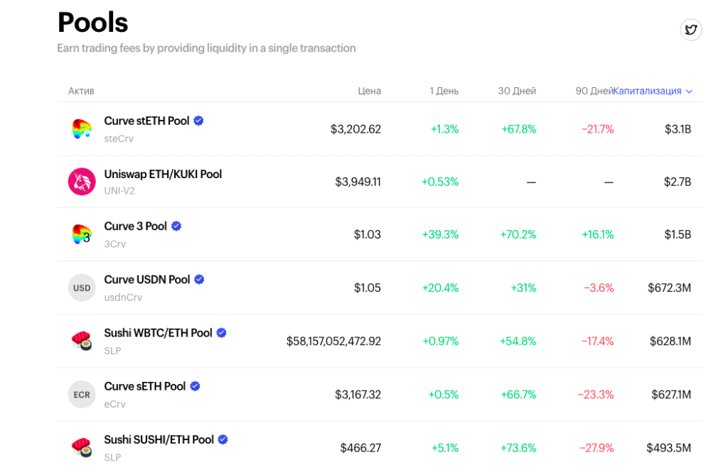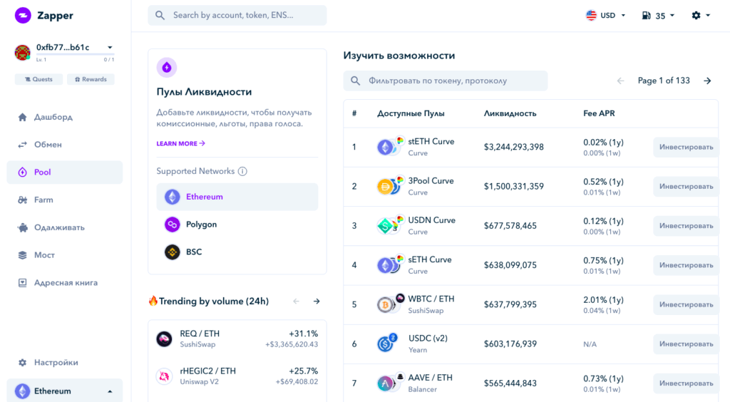 Пулы ликвидности. Пользователь может предоставлять ликвидность в один из выбранных пулов в сетях Ethereum, Polygon и BSC непосредственно через Zapper.