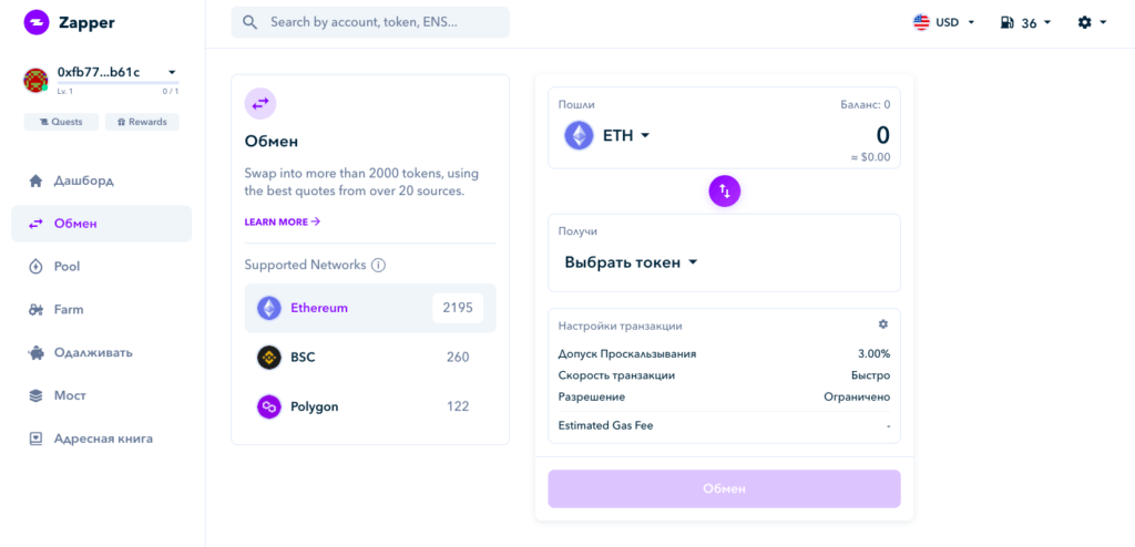 Обмен. Пользователь может обменять более 2 000 различных токенов, представленных на более чем 20 DEX, прямо из Zapper.