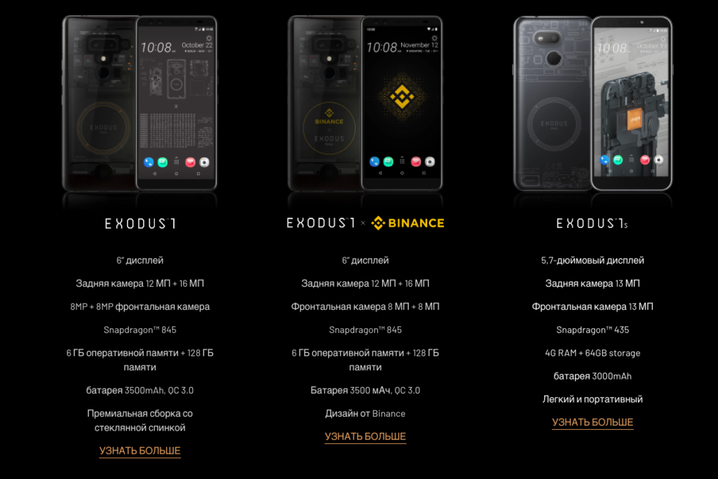 В ноябре 2019 года HTC выпустила еще две модели криптофонов: Exodus 1S — с незначительными техническими усовершенствованиями, и Exodus Binance — совместный проект с крупнейшей криптобиржей на рынке. Exodus Binance получил в Zion встроенную поддержку децентрализованной биржи Binance DEX. Цена этих устройств — около $700.