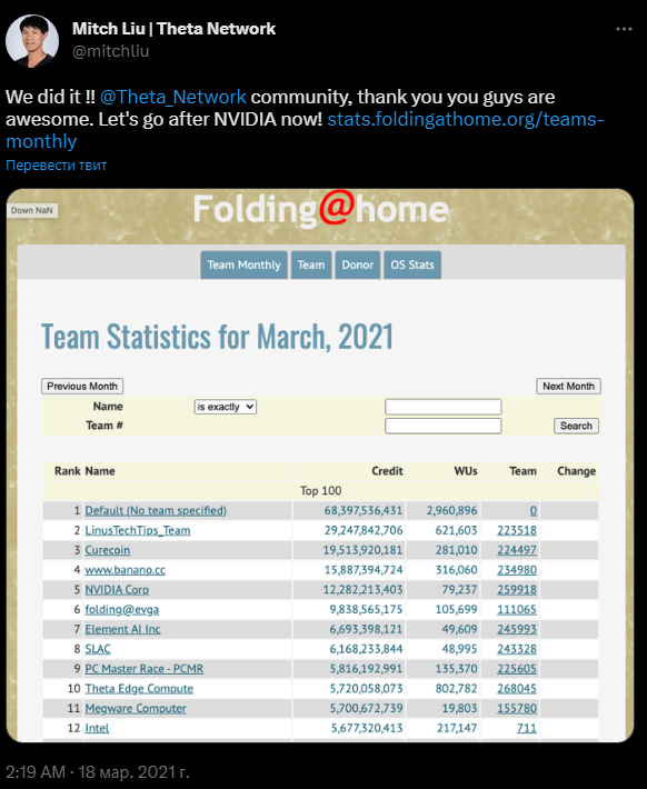 Мы сделали это! Спасибо комьюнити @Theta_Network, вы молодцы. Давайте теперь догоним NVIDIA!Источник