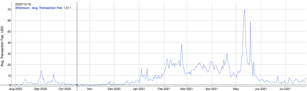 Масштабируемость — основная проблема Ethereum. Сеть часто перегружается: транзакции проходят медленно, а стоимость комиссий (газа) растет, обновляя рекорды. Так, в мае она достигла исторического максимума в $70, хотя годом ранее составляла менее $0.5.