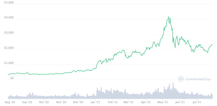 График цены ЕТН за последний год, по данным Coinmarketcap.com. Монета находится в нисходящем тренде с мая этого года. Источник